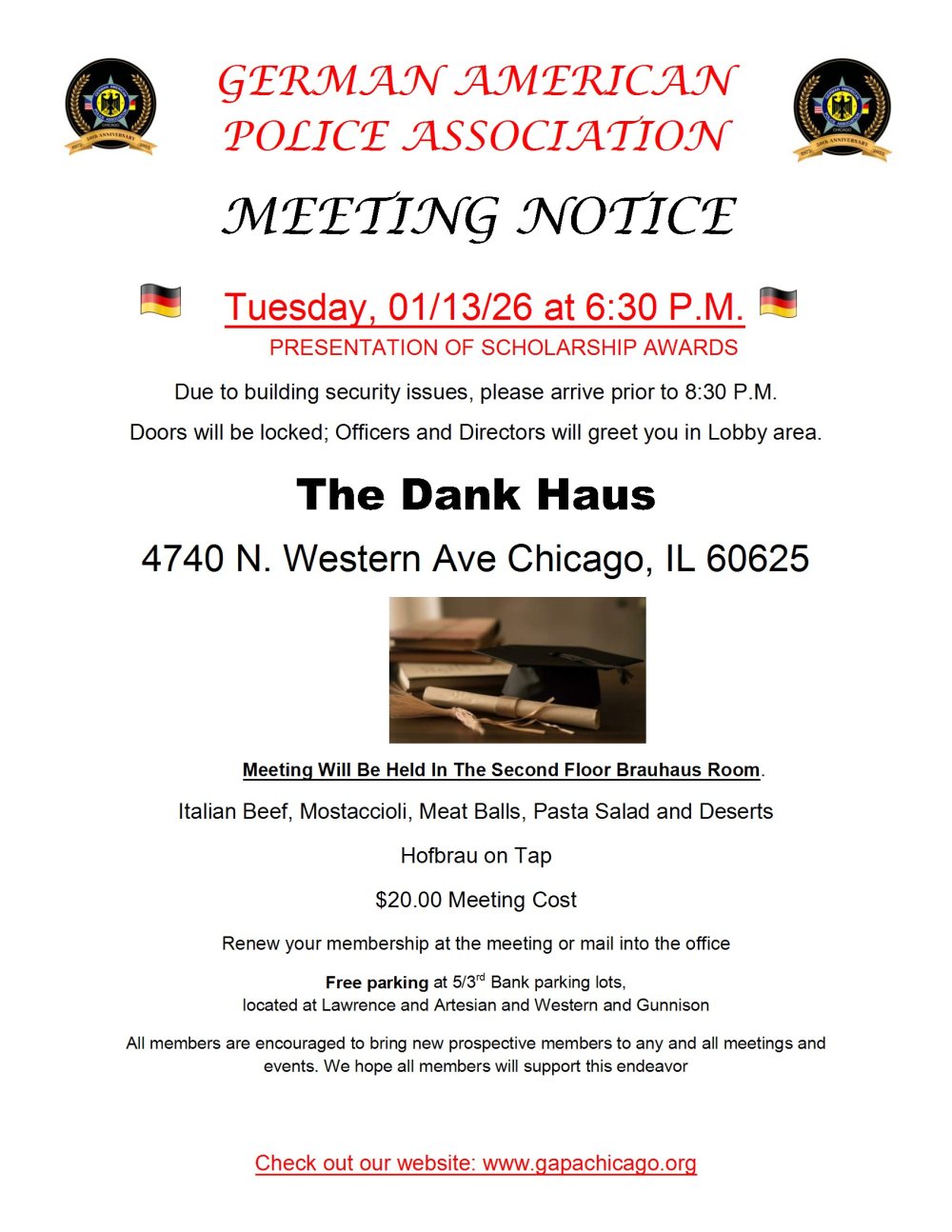 The German American Police Association invites members to attend the January Meeting and Scholarship Awards Presentation on Tuesday, January 13, 2026, at 6:30 PM at The Dank Haus in Chicago.